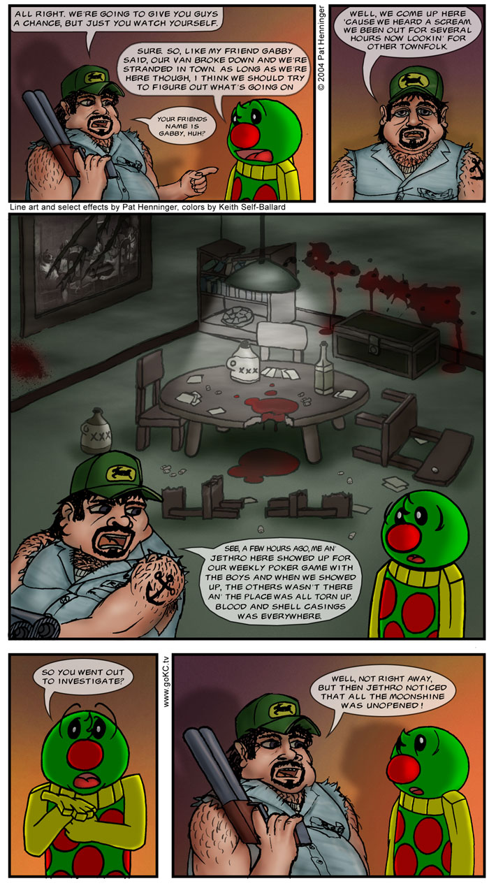 This week we return to the Someplace Scary storyline. I am pretty happy with the total effect of this particular strip, especially the flashback visualization as Red explains his evening. As far as the story itself goes, at least our friends now have some hope of getting an explanation as to what is happening in Stalter. |