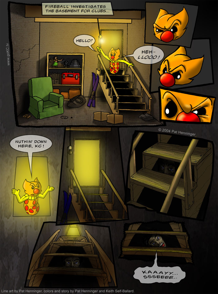 Welcome to episode 20 of the Someplace Scary storyline. If you are new to goKC!, I suggest going to the Past Strips link on the upper left of this page. That will take you to the comic archive, where all the goKC! strips to-date are arranged in handy chronological order. Next week will be a new installment of Someplace Scary. |