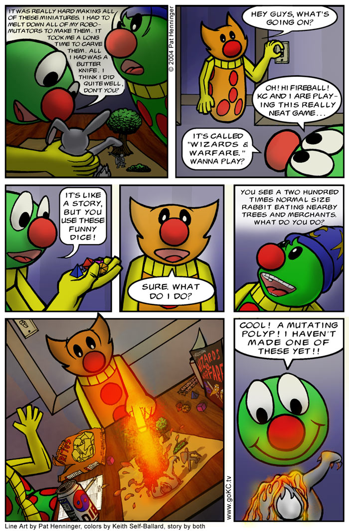 | This is the second page of the first modern goKC! story, created before the online comic began. This story is probably about eight to ten years old and will eventually fill more than 50 episodes (or pages, since it was originally intended to be a comic book). As time goes by, additional pages will be posted to slowly build the backstory. If you look at the Past Strips portion of this site, you will note that this storyline is listed chronoligically before the first web comic episode. |